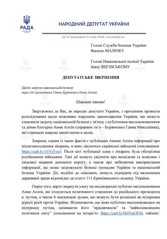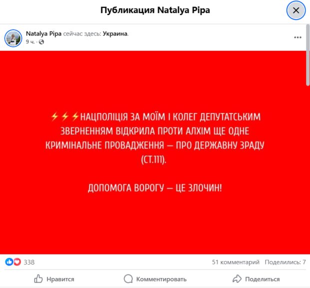 «Нацполіція за моїм і колег депутатським зверненням відкрила проти Алхім ще одне кримінальне провадження - про державну зраду. Допомога ворогу - це злочин», - повідомила народний депутат.