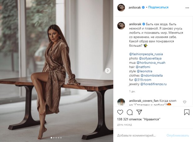 Популярная украинская певица Ани Лорак сейчас живет и работает в России. Исполнительница на сцене почти 20 лет и в течение время активно выпускает новые песни и видео клипы, которые становятся хитами и звучат со всех радиостанций. Кроме того знаменитость является активным пользователем социальных сетей, в которых постоянно делится новыми публикациями.