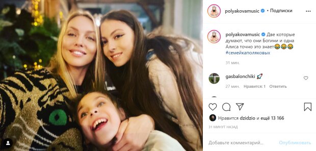 Подписаться"Две которые думают, что они Богини и одна Алиса точно это знает😂😂😂 #семейкаполяковых ", - написала Полякова.