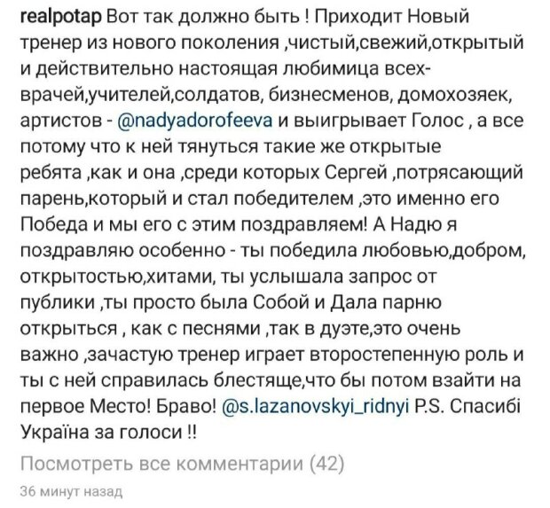 Украинский репер Потап разместил пост, в котором поздравил Надю Дорофееву с победой. Он акцентировал внимание на том, что Тина Кароль в этот раз не смогла победить, так как ее фанаты не смогли продвинуть свою любимицу к победе, назвав их "горсточкой фанатов, отчаянно топящих за свою икону".